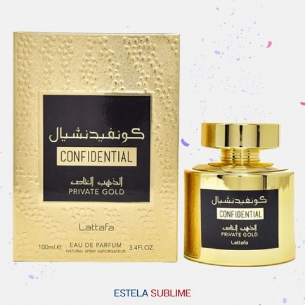 CONFIDENTIAL PRIVATE GOLD DE LATTAFA PERFUMES ES UNA FRAGANCIA DE LA FAMILIA OLFATIVA CHIPRE FRUTAL PARA HOMBRES Y MUJERES. CONFIDENTIAL PRIVATE GOLD SE LANZÓ EN 2020. LAS NOTAS DE SALIDA SON DURAZNO (MELOCOTÓN), MARACUYÁ (FRUTA DE LA PASIÓN), PERA, FRAMBUESA Y CASIS (GROSELLERO NEGRO); LA NOTA DE CORAZÓN ES LIRIO DE LOS VALLES (MUGUETE); LAS NOTAS DE FONDO SON ALMIZCLE, VAINILLA, SÁNDALO, PACHULÍ Y HELIOTROPO.