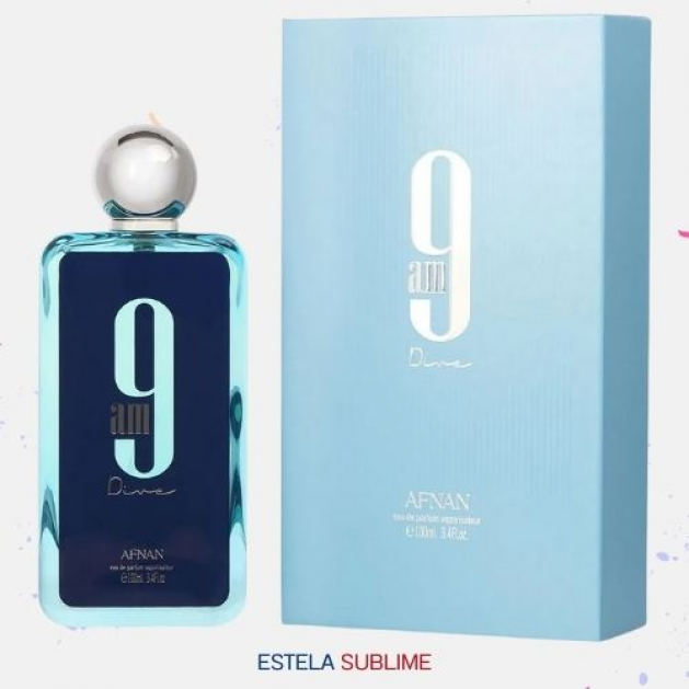 9AM DIVE DE AFNAN ES UNA FRAGANCIA DE LA FAMILIA OLFATIVA AROMÁTICA ACUÁTICA PARA HOMBRES Y MUJERES. ESTA FRAGANCIA ES NUEVA. 9AM DIVE SE LANZÓ EN 2022. LAS NOTAS DE SALIDA SON LIMÓN (LIMA ÁCIDA), MENTA, GROSELLAS NEGRAS Y PIMIENTA ROSA; LAS NOTAS DE CORAZÓN SON MANZANA, CEDRO Y INCIENSO; LAS NOTAS DE FONDO SON JENGIBRE, SÁNDALO, PACHULÍ Y JAZMÍN.