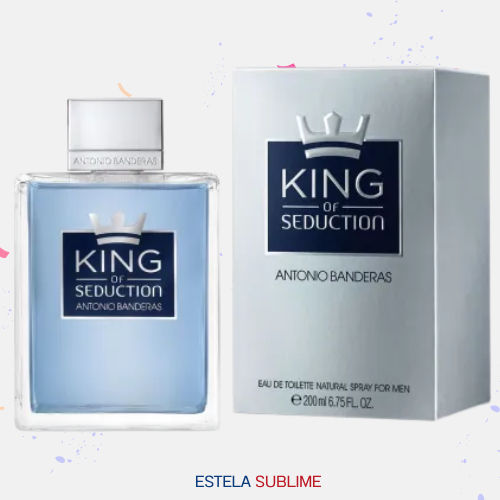 KING OF SEDUCTION DE ANTONIO BANDERAS ES UNA FRAGANCIA DE LA FAMILIA OLFATIVA AMADERADA AROMÁTICA PARA HOMBRES. KING OF SEDUCTION SE LANZÓ EN 2014. LA NARIZ DETRÁS DE ESTA FRAGRANCIA ES OLIVIER CRESP. LAS NOTAS DE SALIDA SON PIÑA, MELÓN, BERGAMOTA, MANZANA VERDE Y TORONJA (POMELO); LAS NOTAS DE CORAZÓN SON NOTAS MARINAS, JAZMÍN, CARDAMOMO Y NEROLI; LAS NOTAS DE FONDO SON VETIVER, ALMIZCLE BLANCO, CEDRO, GAMUZA Y ÁMBAR.