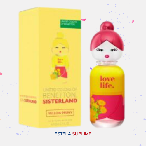 SISTERLAND YELLOW PEONY DE BENETTON ES UNA FRAGANCIA FLORAL FRUTAL PARA MUJER. SISTERLAND YELLOW PEONY SE LANZÓ EN 2023. SU AROMA ES EL DE ALEXANDRA MONET. LAS NOTAS DE SALIDA SON FRAMBUESA, POMELO Y BERGAMOTA; LAS NOTAS DE CORAZÓN, PEONÍA, FLOR DE AZAHAR Y PIMIENTA ROSA; Y LAS NOTAS DE FONDO, ALMIZCLE, ÁMBAR Y MUSGO.