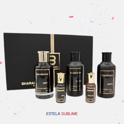 1-PERFUME ONYX 100 ML/1-PERFUME ONYX 10 ML/1-CREMA 200 ML/1-GEL DE DUCHA 200 ML/1-PERFUME CHOCOLATE 10 ML ONYX DE BHARARA ES UNA FRAGANCIA DE LA FAMILIA OLFATIVA AMADERADA AROMÁTICA PARA HOMBRES Y MUJERES. ESTA FRAGRANCIA ES NUEVA. ONYX SE LANZÓ EN 2026. LAS NOTAS DE SALIDA SON CILANTRO, BERGAMOTA Y FLORES; LAS NOTAS DE CORAZÓN SON MANZANA, AMBROXAN Y VAINILLA; LAS NOTAS DE FONDO SON ÁMBAR GRIS, HABA TONKA Y NOTAS AMADERADAS.